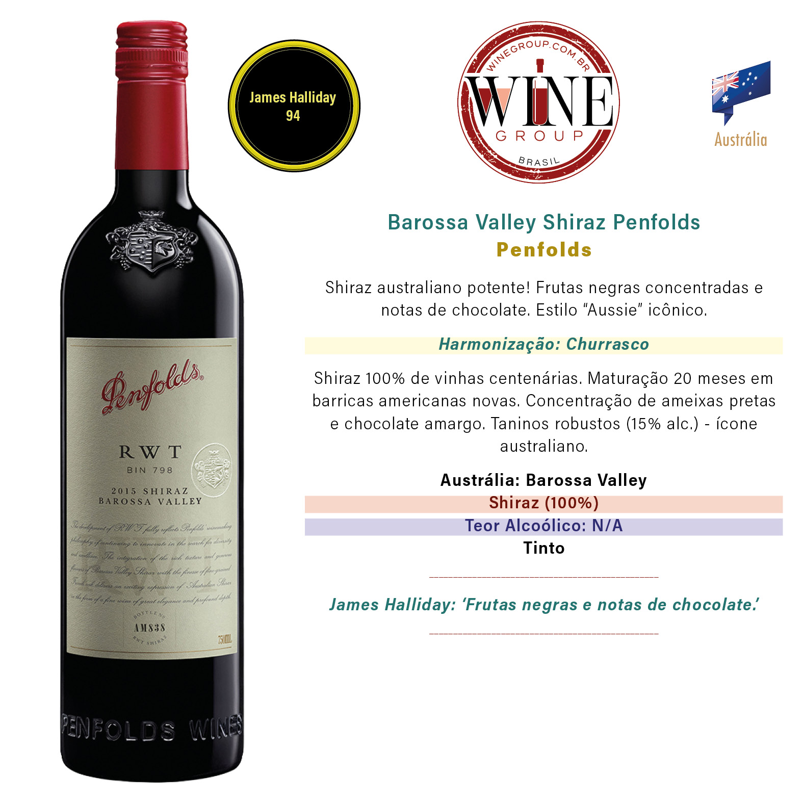 Austrália // Barossa Valley // Penfolds // Shiraz (100%) // N/A // Tinto // James Halliday 94 pts. // James Halliday: ‘Frutas negras e notas de chocolate.’ // Harmonização: Churrasco // // Shiraz australiano potente! Frutas negras concentradas e notas de chocolate. Estilo “Aussie” icônico. // Shiraz 100% de vinhas centenárias. Maturação 20 meses em barricas americanas novas. Concentração de ameixas pretas e chocolate amargo. Taninos robustos (15% alc.) – ícone australiano.