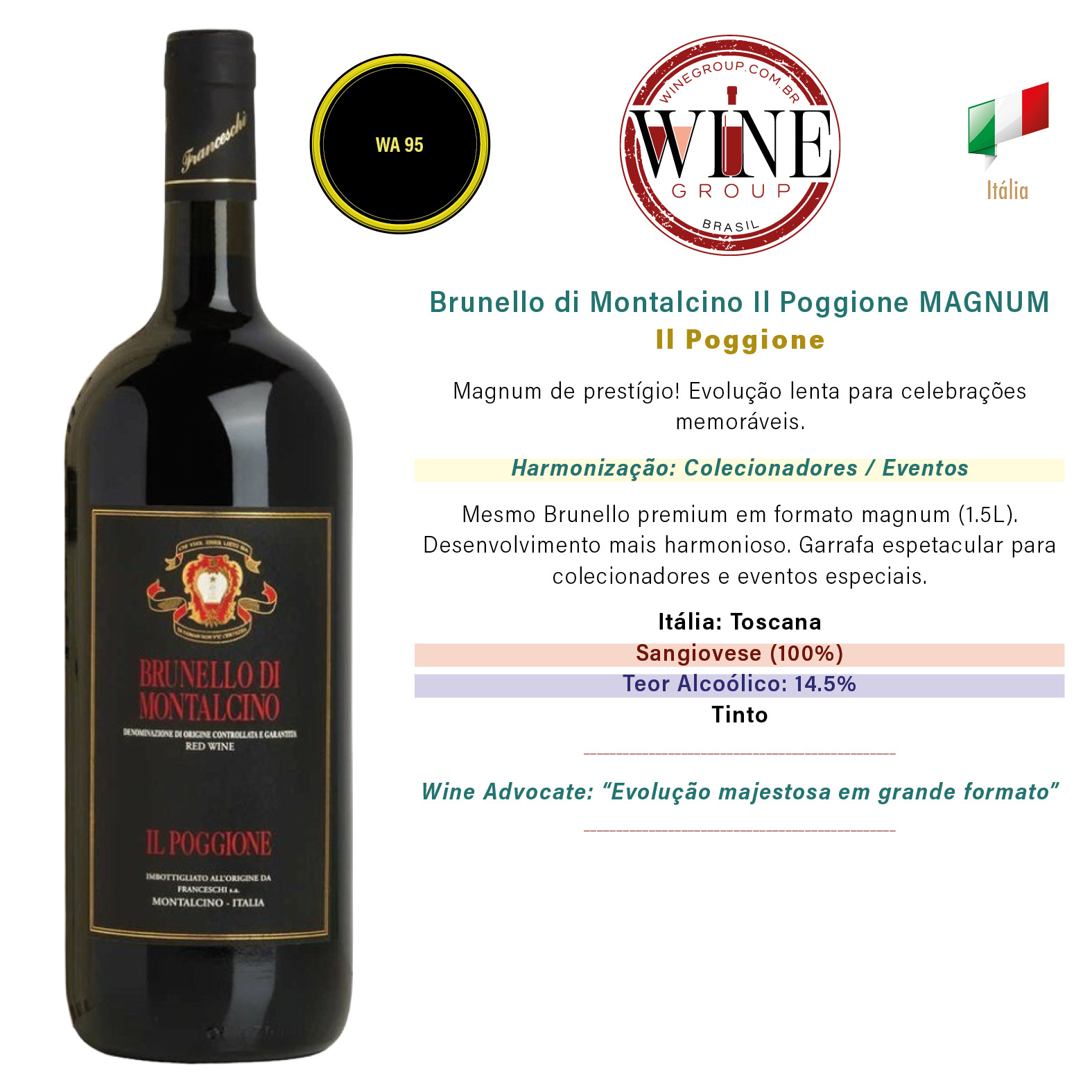 Itália // Toscana // Il Poggione // Sangiovese (100%) // 14.5% // Tinto // Wine Advocate 95 pts. // Wine Advocate: “Evolução majestosa em grande formato” // Harmonização: Colecionadores / Eventos // // Magnum de prestígio! Evolução lenta para celebrações memoráveis. // Mesmo Brunello premium em formato magnum (1.5L). Desenvolvimento mais harmonioso. Garrafa espetacular para colecionadores e eventos especiais.