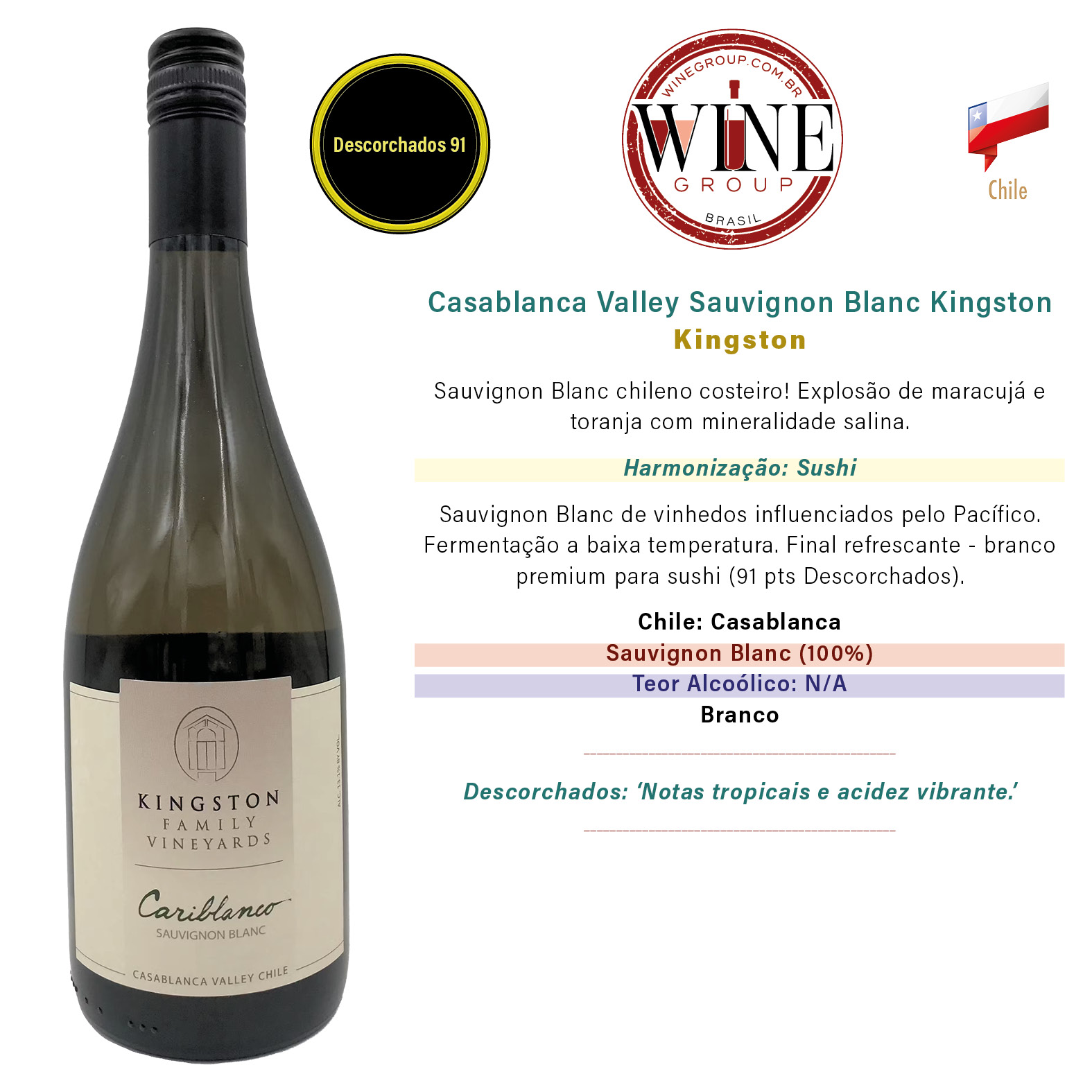 Chile // Casablanca // Kingston // Sauvignon Blanc (100%) // N/A // Branco // Descorchados 91 pts. // Descorchados: ‘Notas tropicais e acidez vibrante.’ // Harmonização: Sushi // // Sauvignon Blanc chileno costeiro! Explosão de maracujá e toranja com mineralidade salina. // Sauvignon Blanc de vinhedos influenciados pelo Pacífico. Fermentação a baixa temperatura. Final refrescante – branco premium para sushi (91 pts Descorchados).