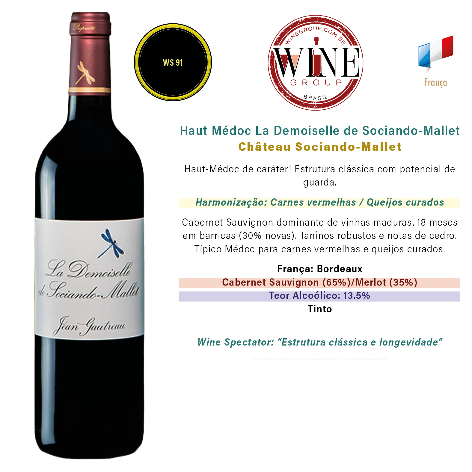 França // Bordeaux // Château Sociando-Mallet // Cabernet Sauvignon (65%)/Merlot (35%) // 13.5% // Tinto // Wine Spectator 91 pts. // Wine Spectator: “Estrutura clássica e longevidade” // Harmonização: Carnes vermelhas / Queijos curados // // Haut-Médoc de caráter! Estrutura clássica com potencial de guarda. // Cabernet Sauvignon dominante de vinhas maduras. 18 meses em barricas (30% novas). Taninos robustos e notas de cedro. Típico Médoc para carnes vermelhas e queijos curados.