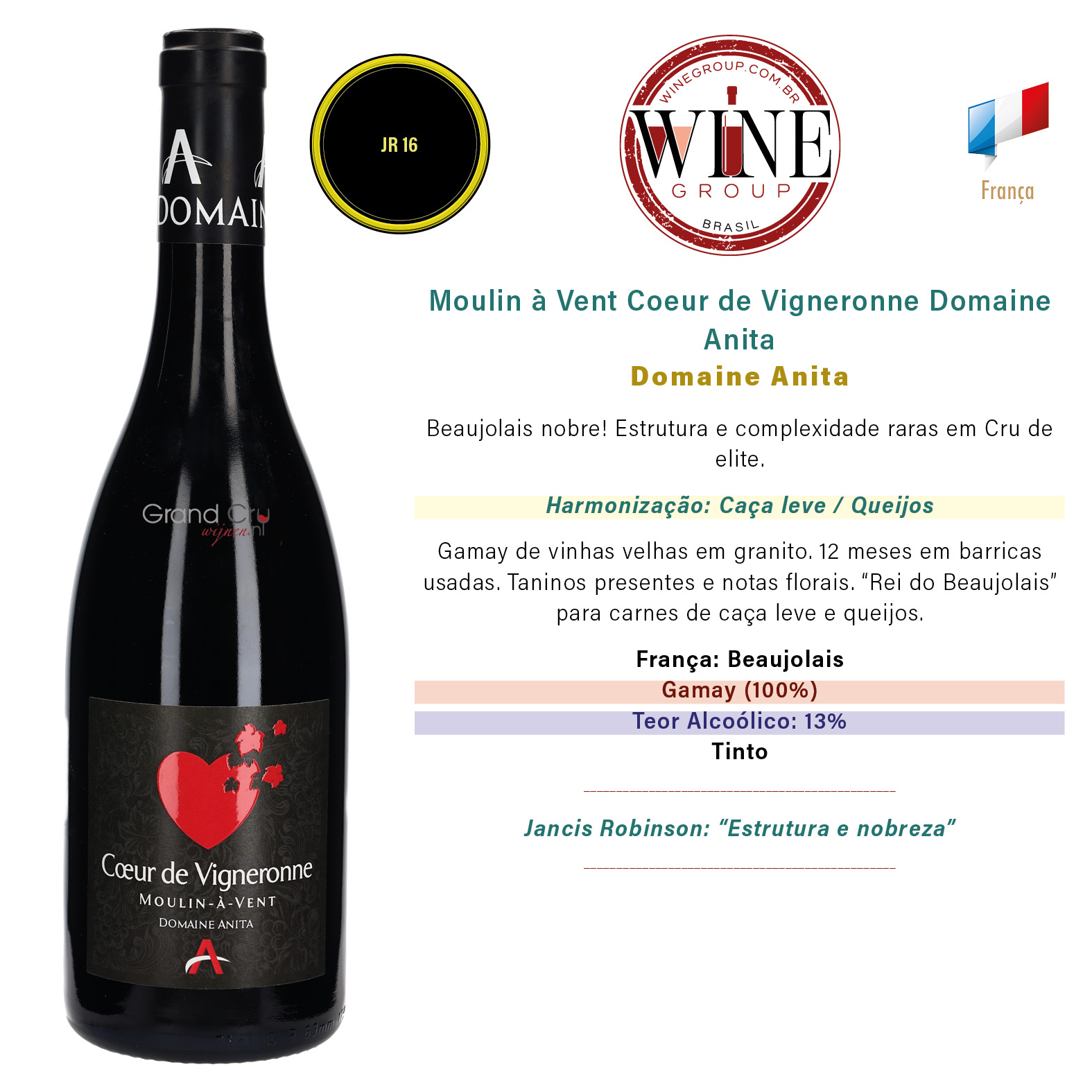 França // Beaujolais // Domaine Anita // Gamay (100%) // 0,13 // Tinto // Jancis Robinson 16 pts. // Jancis Robinson: “Estrutura e nobreza” // Harmonização: Caça leve / Queijos // // Beaujolais nobre! Estrutura e complexidade raras em Cru de elite. // Gamay de vinhas velhas em granito. 12 meses em barricas usadas. Taninos presentes e notas florais. “Rei do Beaujolais” para carnes de caça leve e queijos.