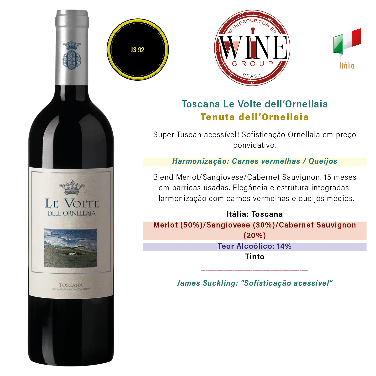 Itália // Toscana // Tenuta dell’Ornellaia // Merlot (50%)/Sangiovese (30%)/Cabernet Sauvignon (20%) // 0,14 // Tinto // James Suckling 92 pts. // James Suckling: “Sofisticação acessível” // Harmonização: Carnes vermelhas / Queijos // // Super Tuscan acessível! Sofisticação Ornellaia em preço convidativo. // Blend Merlot/Sangiovese/Cabernet Sauvignon. 15 meses em barricas usadas. Elegância e estrutura integradas. Harmonização com carnes vermelhas e queijos médios.